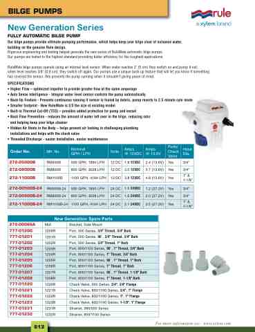 SPECIFICATIONS • Higher Flow – optimized impeller to provide greater flow at the same amperage • Auto Sense Intelligence - Integral water level sensor controls the pump automatically • Back-Up Feature - Prevents continuous running if sensor is fouled by debris, pump reverts to 2.5 minute cyle mode • Smaller footprint - New RuleMate is 2/3 the size of existing model • Built-in Thermal Cut-Off (TCO) – provides added protection for pump and vessel • Back Flow Prevention - reduces the amount of water left over in the bilge, reducing odor