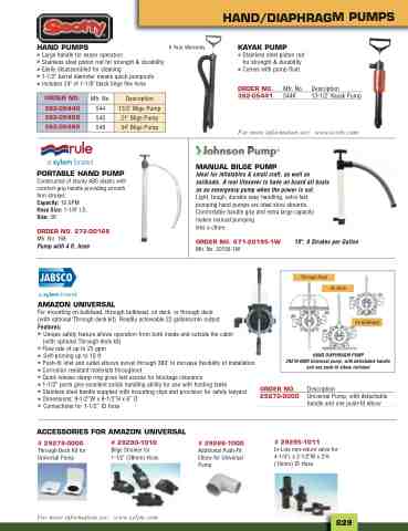 Self-priming up to 10 ft Push-fit inlet and outlet elbows swivel through 360˚ to increase flexibility of installation Corrosion resistant materials throughout Quick release clamp ring gives fast access for blockage clearance 1-1/2” ports give excellent solids handling ability for use with holding tanks Stainless steel handle supplied with mounting clips and provision for safety lanyard Dimensions: 9-1/2”W x 9-1/2”H x 6” D