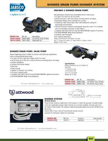 New generation, long life fully serviceable shower drain pump. • 3.5 gpm (13.2 lpm) at 3ft (1m) head. • Self-priming up to 10ft (3m) allows mounting above wet bilges. • Diaphragm design allows extended dry running. • Continuous rated, heavy duty motor with waterproof coating for