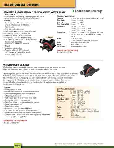 • Non-choke valves - no filters required • Self-priming up to 3 meters (9.8 feet) • Can be run dry and can pump air/water mixture • Robust single diaphragm • KlickTiteTM XL connectors standard • 12 Volt • Low power consumption • Complies with ISO15083 and small