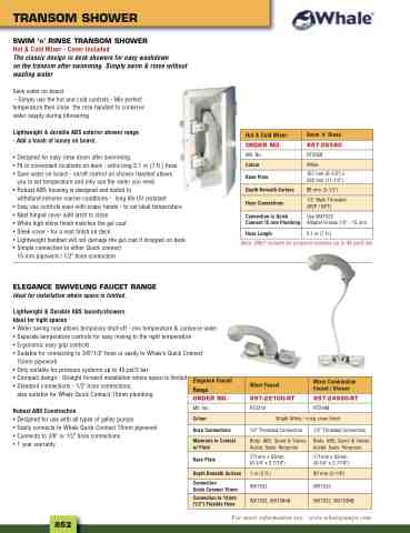 Lightweight & Durable ABS faucets/showers Ideal for tight spaces • Water saving rose allows temporary shut-off - mix temperature & conserve water • Separate temperature controls for easy mixing to the right temperature • Ergonomic easy grip controls • Suitable for connecting to 3/8"/1/2" hose or easily to Whale’s Quick Connect