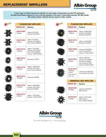 A wide range of suitable replacement impellers for most engine cooling pumps and other FIP applications. The Albin Pump Marine impellers are one of the best impellers in the world. 2 year limited warranty. ISO 9001 quality. Kits contain impeller, lubricant and any required o-rings / gaskets.