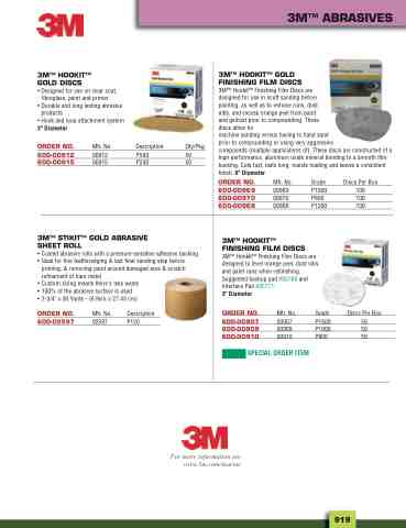 3MTM HOOKITTM GOLD FINISHING FILM DISCS 3MTM HookitTM Finishing Film Discs are designed for use in scuff sanding before painting, as well as to remove runs, dust nibs, and excess orange peel from paint and gelcoat prior to compounding. These discs allow for machine sanding versus having to hand sand prior to compounding or using very aggressive compounds (multiple applications of). These discs are constructed of a high performance, aluminum oxide mineral bonding to a smooth film backing. Cuts fast, lasts long, resists loading and leaves a consistent finish. 6" Diameter