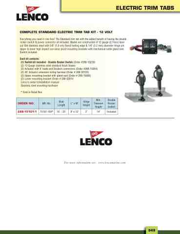 Each kit contains: (1) Switch kit included - Double Rocker Switch (Order #288-10220) (2) 12-Gauge stainless steel standard finish blades (2) Actuator with 6' leads and Deutsch connectors (Order #288-15054) (2) 20' Actuator extension wiring harness (Order # 288-30133) (2) Upper mounting bracket with gland seal (Order # 288-15085) (2) Lower mounting bracket (Order # 288-50014 Lenco’s owner’s/installation manual Stainless steel mounting hardware