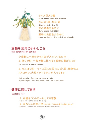 ライス豆入り麺 たんぱく質、低GI値 豆の栄養を多めに 澱粉の負担を少なめに 豆麺を食用のいいところ 小麦粉に一部のライス豆が入っているので 1、低G I値--一般の麺に比べると澱粉の量が少ない 2、たんぱく質---ライス豆には豆たんぱく質、植物性エ ストロゲン、大豆イソフラボンが入ってます 健康に適してます 1、血糖をコントロールしてる家族 2、赤ちゃんの食べ物 (水を切って多めの塩分を除きましょう)