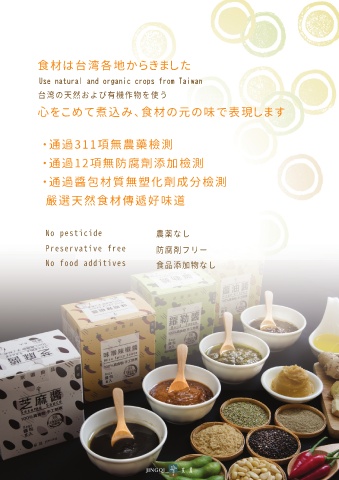Sauce 食材は台湾各地からきました Use natural and organic crops from Taiwan 台湾の天然および有機作物を使う 心をこめて煮込み、食材の元の味で表現します ・通過311項無農藥檢測 ・通過12項無防腐劑添加檢測 ・通過醬包材質無塑化劑成分檢測 嚴選天然食材傳遞好味道 No pesticide 農薬なし Preservative free 防腐剤フリー No food additives 食品添加物なし