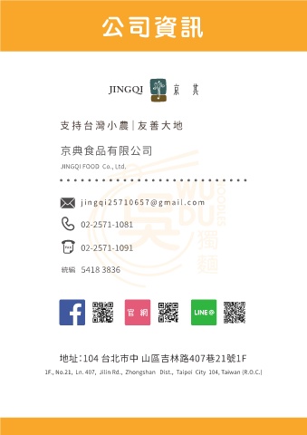 公司資訊 支持台灣小農|友善大地 京典食品有限公司 JINGQI FOOD Co., Ltd. jing qi25710657@gmail.com 02-2571-1081 02-2571-1091 5418 3836 地址:104 台北市中 山區吉林路407巷21號1F 1F., No.21, Ln. 407, Jilin Rd., Zhongshan Dist., Taipei City 104, Taiwan (R.O.C.)