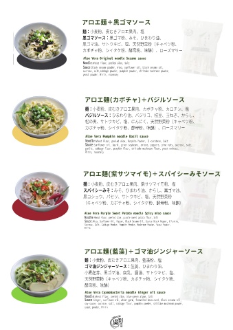麺:小麦粉、皮むきアロエ果肉、紫サツマイモ粉、塩