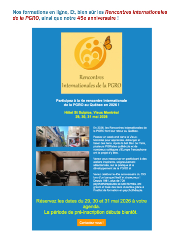 Nos formations en ligne, Et, bien sûr les Rencontres internationales de la PGRO, ainsi que notre 45e anniversaire !