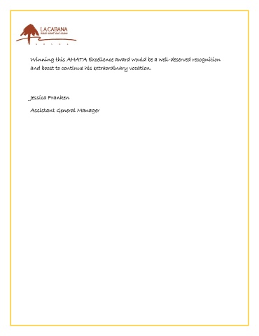 Winning this AHATA Excellence award would be a well-deserved recognition and boost to continue his extraordinary vocation. Jessica Franken Assistant General Manager