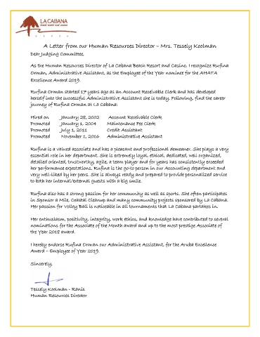 As the Human Resources Director of La Cabana Beach Resort and Casino, I recognize Rufina