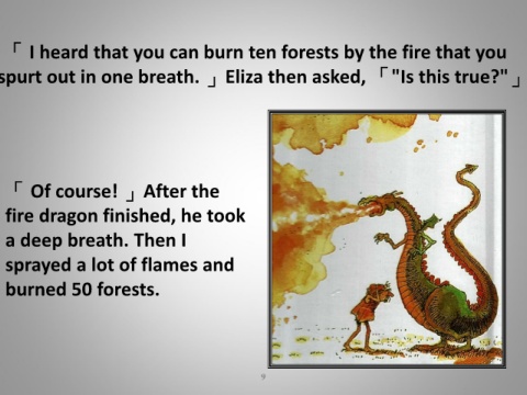 「 I heard that you can burn ten forests by the fire that you spurt out in one breath. 」Eliza then asked, 「"Is this true?"」 「 Of course! 」After the fire dragon finished, he took a deep breath. Then I sprayed a lot of flames and burned 50 forests. 9