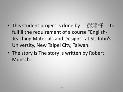 • This student project is done by __彭翊軒__ to fulfill the requirement of a course "English- Teaching Materials and Designs" at St. John's University, New Taipei City, Taiwan. • The story is The story is written by Robert Munsch. 20