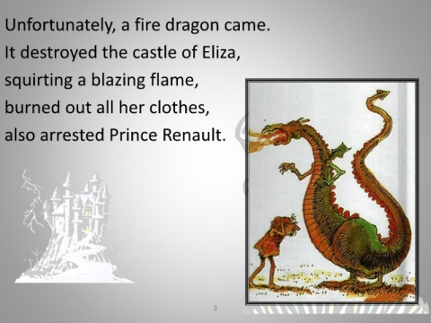 Unfortunately, a fire dragon came. It destroyed the castle of Eliza, squirting a blazing flame, burned out all her clothes, also arrested Prince Renault. 2