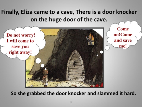 Finally, Eliza came to a cave, There is a door knocker on the huge door of the cave. Come Do not worry! on!Come I will come to and save save you me! right away! So she grabbed the door knocker and slammed it hard. 5
