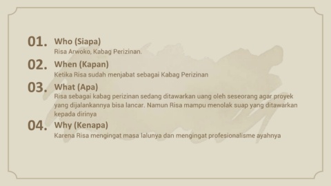 yang dijalankannya bisa lancar. Namun Risa mampu menolak suap yang ditawarkan