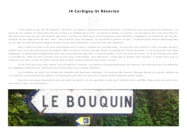 t J'entre dans le lieu dit "le bouquin". Peu être un hameau rempli d'anciennes librairies ! Je hume les roses qui ornent les demeures, j'ai Plus j'avance et plus je me sens enveloppée par la nature. Comme une seconde peau. On pourrait vite revenir à l’état sauvage. Heureu- Je me sens bien avec moi même, plus de pulsions internes. Les douleurs psychosomatiques ont disparu. Pas étonnant que les médecins Je m'in