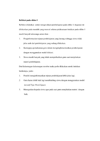 Refleksi dilakukan untuk mengevaluasi pembelajaran pada siklus 1, kegiatan ini