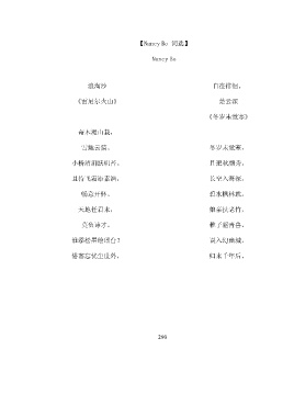 【Nancy Bo 词选】 Nancy Bo 浪淘沙 自在徘徊。 《雷尼尔火山》 楚云深 《冬岁未觉寒》 奇木漫山栽, 雪魅云猜。 冬岁未觉寒, 小桥清涧跃矶苔。 且把秋颜秀。 且待飞霜添素酒, 长空入海深, 畅意开怀。 碧水枫林就。 天地任君来, 娘亲扶老竹, 莫负诗才。 稚子驱青兽。 谁添松墨绘瑶台? 误入幻幽城, 俗客忘忧尘世外, 归来千年后。 290