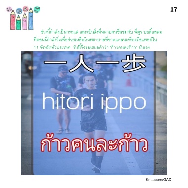 ช่วงนี้ก ำลังเป็นกระแส และเป็นสิ่งที่หลำยคนชื่นชมกับ พี่ตูน บอดี้แสลม ที่ตอนนี้ก ำลังวิ่งเพื่อช่วยเหลือโรงพยำบำลที่ขำดแคลนเครื่องมือแพทย์ใน 11 จังหวัดทั่วประเทศ วันนี้จึงขอเสนอค ำว่ำ "ก้ำวคนละก้ำว“ นั่นเอง Krittaporn/GAD