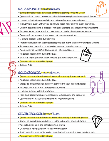 • One (1) private socially distanced tents with seating for up to 6 each • On-screen recognition during the Gala