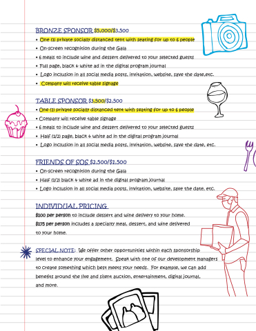 • 6 meals to include wine and dessert delivered to your selected guests • Half (1/2) page, black & white ad in the digital program journal