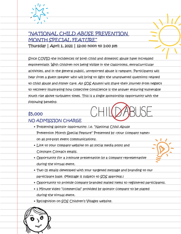 Since COVID the incidences of both child and domestic abuse have increased exponentially. With children not being visible in the classrooms, extracurricular activities, and in the general public, unreported abuse is rampant. Participants will hear from a guest speaker who will bring to light the unanswered questions related to child abuse and foster care. An SOS Alumni will share their journey from neglect to recovery illustrating how collective conscience is the answer ensuring vulnerable youth rise above turbulent times. This is a single sponsorship opportunity with the following benefits: