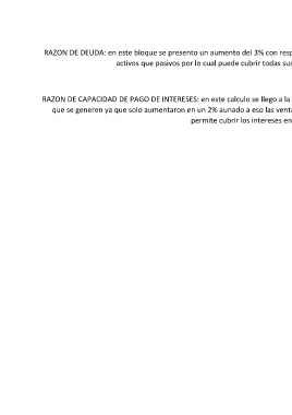 RAZON DE DEUDA: en este bloque se presento un aumento del 3% con respecto a los pasivos lo que nos dice que la empresa cuenta con mas