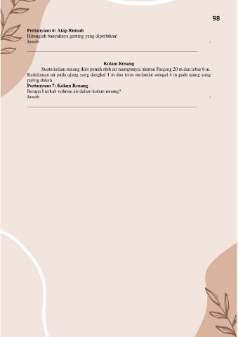 Suatu kolam renang diisi penuh oleh air mempunyai ukuran Panjang 20 m dan lebar 6 m.