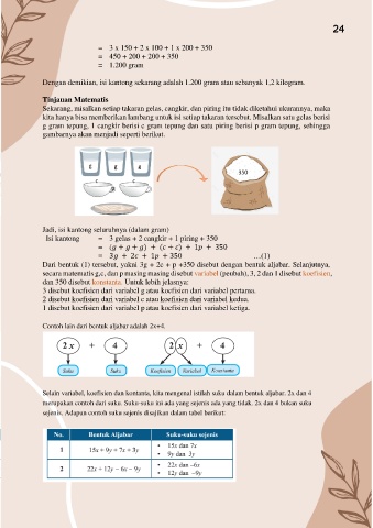 Dari bentuk (1) tersebut, yakni 3g + 2c + p +350 disebut dengan bentuk aljabar. Selanjutnya,