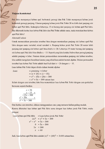 sisi kebun apel Pak Idris bisa ditulis x − 15. Seperti yang kita ketahui bahwa luas persegi panjang