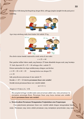 Bentuk    + 25 = 60 disebut persamaan linear satu variabel.