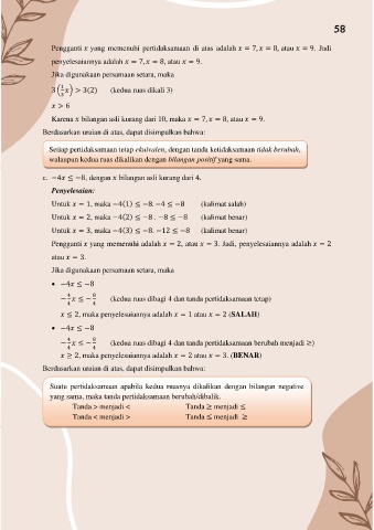 Untuk    = 2, maka −4(2) ≤ −8 . −8 ≤ −8         (kalimat benar)