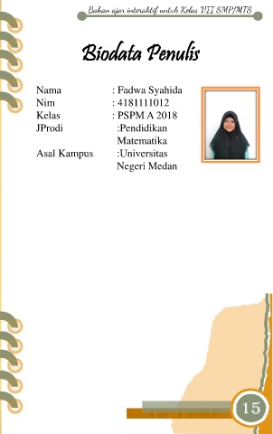 Biodata Penulis Nama : Fadwa Syahida Nim : 4181111012 Kelas : PSPM A 2018 JProdi :Pendidikan Matematika Asal Kampus :Universitas Negeri Medan 15