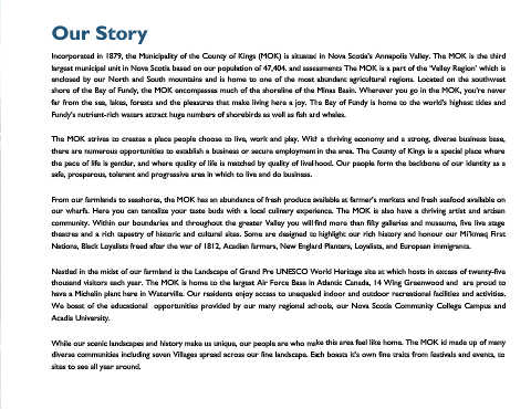 Incorporated in 1879, the Municipality of the County of Kings (MOK) is situated in Nova Scotia’s Annapolis Valley. The MOK is the third