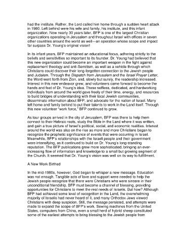 disseminate information about BFP, and advocate for the nation of Israel. Many