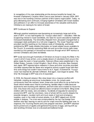 Knesset (Parliament) Christian Allies Caucus was formed in January 2004. BFP