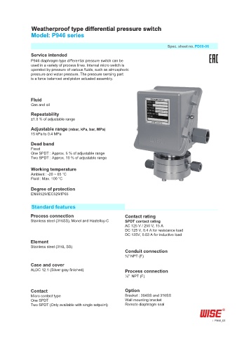 P946 diaphragm type differential pressure switch can be