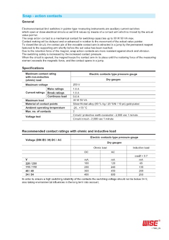 The snap action contact is a mechanical contact for switching capacities up to 30 W 50 VA max.