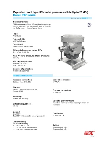 Explosion proof type differential pressure switch (Up to 20 kPa)