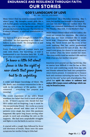 The recent experience of my wife’s friend manifests her belief that God is worth all pains in life. If there’s anyone who should feel that life’s unfair and un-forgiving, I say it must be thisoneparticularfriend. Sheworksasanurse in hospital abroad and takes care of Covid patients every single day since this pandemic happened. She spent long hours serving other people in need and attending the sick on life supports. She had seen unspeakable struggles and fights to win the battle in narrow victory.