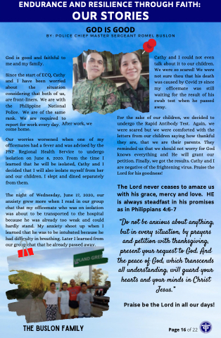 For the sake of our children, we decided to undergo the Rapid Antibody Test. Again, we were scared but we were comforted with the letters from our children saying how thankful they are, that we are their parents. They reminded us that we should not worry for God knows everything and He will grant our petition. Finally, we got the results. Cathy and I are negative of the frightening virus. Praise the Lord for his goodness!