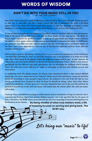 With Covid 19 upon us and plenty of time given to us as a welcome consequence of the lockdown, I decided that watching Dr. Dyer on YouTube would be one of my priorities. It is from one of his talks that I first heard of the phrase “don’t die with your music still in you”. In that episode, he talked about his 2001 book entitled “10 Secrets for Success and Inner Peace”. While it was written specifically for his children and their generation, the ten principles he outlined which include “don’t die with your music still in you” might as well apply to all of us who desires success and inner peace.