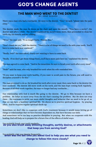 Our relationship with God is much like going to the dentist. We go to Him because we have a problem. He helps us move away from the sin that’s causing the problem. But He does not stop there - He continues to point out more sinful thoughts and behavior that we need to let go of, so that we can have a healthier spiritual life. He shows us to practice spiritual hygiene - by praying often. And he requires regular spiritual check-up.