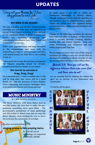 By God’s grace, I was able to utilize my diminutive knowledge in editing videos. Though challenged by the limited capability of the hardware used in rendering better quality videos, our virtual choir first appeared during our hosting of the online regional breakfast last July 18, 2020.