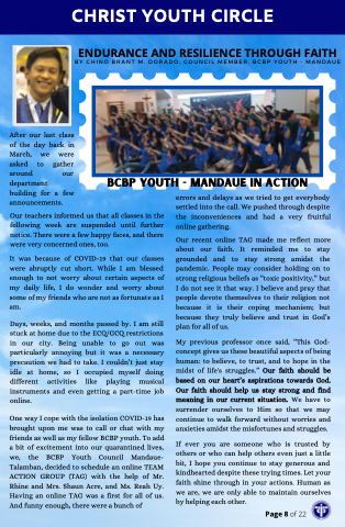 Our recent online TAG made me reflect more about our faith. It reminded me to stay grounded and to stay strong amidst the pandemic. People may consider holding on to strong religious beliefs as “toxic positivity,” but I do not see it that way. I believe and pray that people devote themselves to their religion not because it is their coping mechanism; but because they truly believe and trust in God’s plan for all of us.