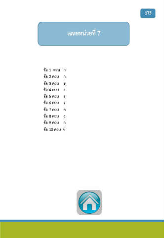 175 เฉลยหน่วยที่ 7 ข้อ 1 ตอบ ก ข้อ 2 ตอบ ก ข้อ 3 ตอบ ข ข้อ 4 ตอบ ง ข้อ 5 ตอบ จ ข้อ 6 ตอบ จ ข้อ 7 ตอบ ค ข้อ 8 ตอบ ง ข้อ 9 ตอบ ก ข้อ 10 ตอบ ข