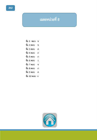 212 เฉลยหน่วยที่ 8 ข้อ 1 ตอบ จ ข้อ 2 ตอบ ข ข้อ 3 ตอบ ค ข้อ 4 ตอบ ก ข้อ 5 ตอบ ก ข้อ 6 ตอบ ง ข้อ 7 ตอบ จ ข้อ 8 ตอบ ก ข้อ 9 ตอบ ค ข้อ 10 ตอบ ง