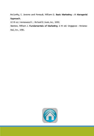 McCarthy, E. Jerome and Perrault, William D. Basic Marketing : A Managerial Approach. 10 th ed. Homewood II. : Richard D. Irwin, Inc., 1990. Stanton, William J. Fundamentals of Marketing. 6 th ed. Singapore : McGraw- Hall, Inc., 1981.