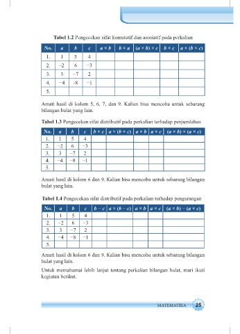 Tabel 1.4 Pengecekan sifat distributif pada perkalian terhadap pengurangan